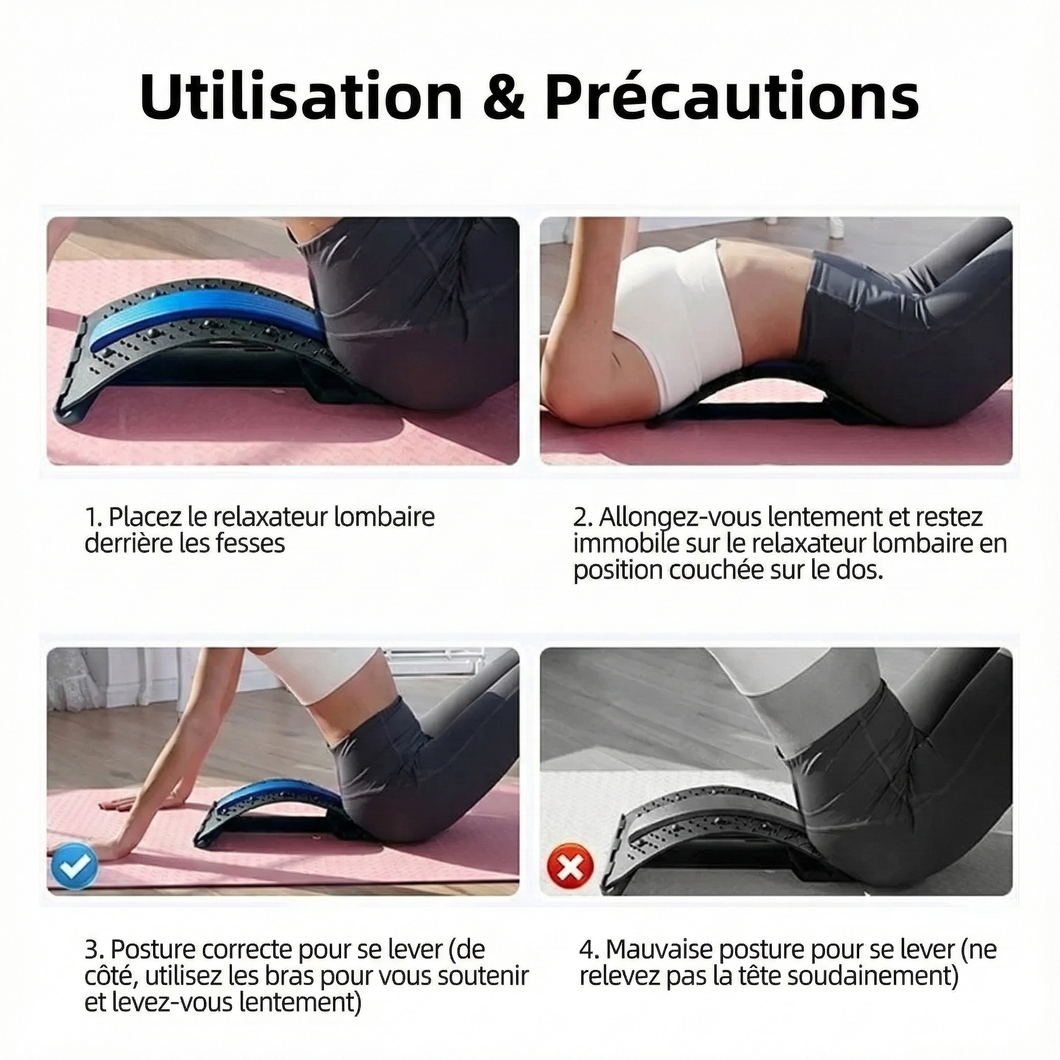 Description : Pour profiter pleinement des bienfaits de votre étireur dorsal Relaxa® et soulager vos tensions en toute sécurité, suivez ces 4 étapes essentielles :